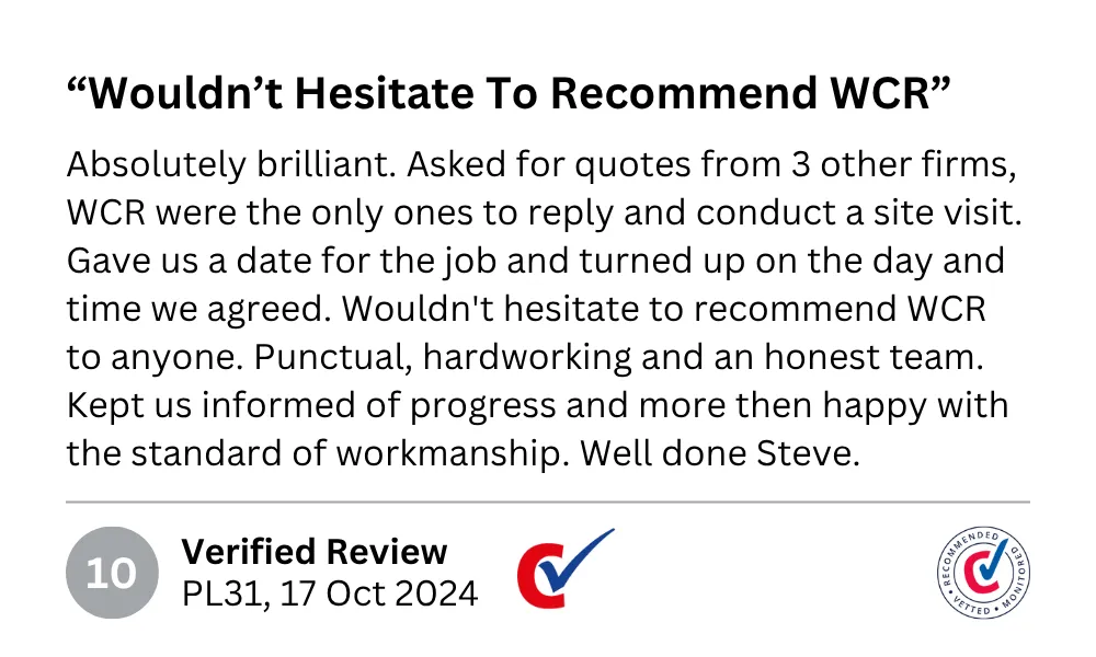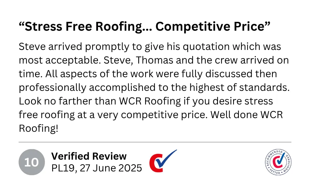 Lots of firms offer domestic roofing services in Plymouth, but very few share WCR Roofing’s reputation for meticulous workmanship and remarkable customer service. We provide all of this at a price that makes sense to homeowners. So don’t hesitate to get in touch with us today and we'll help you out with a service you can trust."